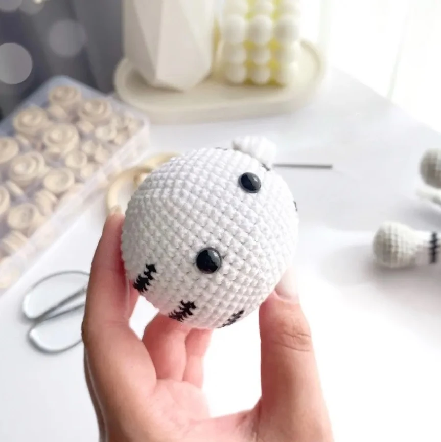 - R 11: 8 sc with white yarn, 11 sc with black yarn, 16 sc with white, 11 sc with black, 8 sc with white (54)