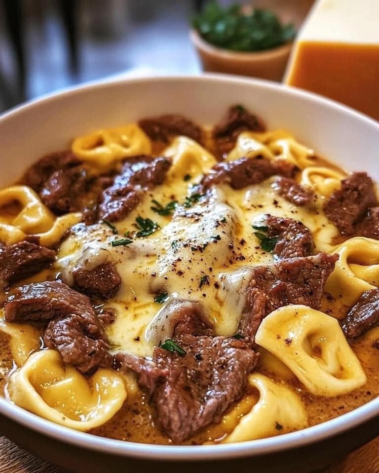 - Return the cooked beef to the skillet, then add the drained tortellini. Toss everything together to coat the tortellini and beef in the rich provolone sauce.