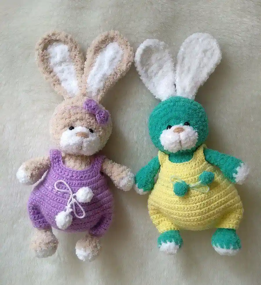 These plush bunnies are crocheted using Alize Softy yarn. Follow the amigurumi bunny crochet pattern by Yulia Kravchenko to learn how to create the bunny, as well as the jumpsuit adorned with fluffy pom-poms. For one bunny, you’ll need one skein of the main color yarn. The finished height of the bunny is approximately 19 cm (without the ears).