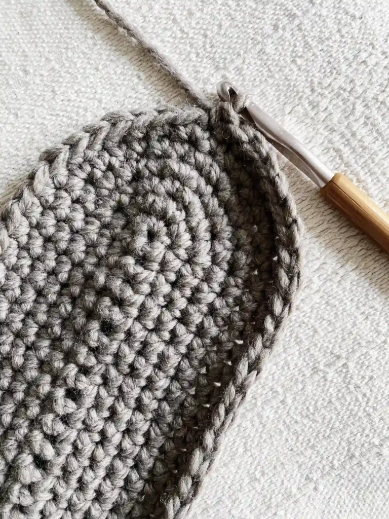 - Starting in 2nd ch from hook, sc to end of row, sc twice more into end ch (3 sts total in this ch), continue around the other side of ch and starting in the back of the next ch, sc to the end of the round, sc twice into the starting ch (3 sts total in this ch).