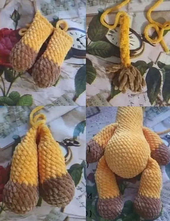 - 7 sc, 6 sc with first leg, 15 sc, 6 sc with second leg, 8 sc (42)