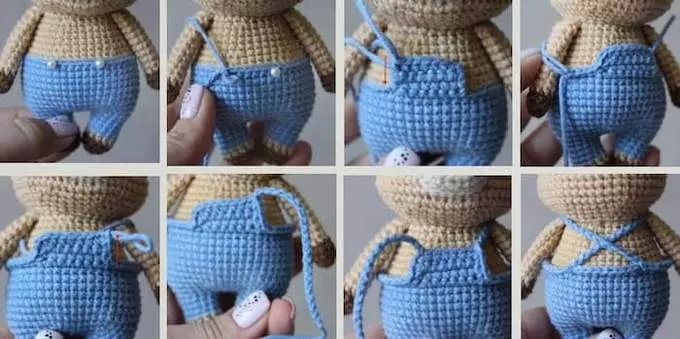 Without cutting the yarn, make a strap from ch. I made 20 ch, but your quantity may vary. The length of the strap should be enough to cross over the back and sew to the beginning of the pants. My straps cross in the shape of a cross. Join the yarn to the other side of the pants and make the second strap. Sew them to the beginning of the pants.